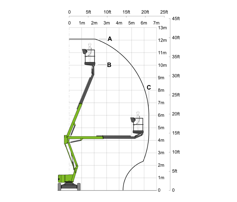 Voor installatiewerk, onderhoud aan gebouwen, schilderwerk of inspecties op moeilijk bereikbare plekken is de Zoomlion ZA14J een veelzijdige knikarmhoogwerker om te huren. Dankzij een werkhoogte van 15,80 meter, een indrukwekkend horizontaal bereik van 8,30 meter en de wendbare 1,24 meter lange extra beweegbare arm aan het uiteinde (jib), positioneert u zich uiterst nauwkeurig.