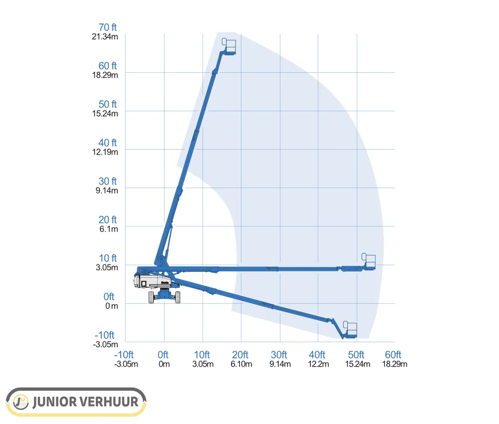 Deze robuuste, diesel-aangedreven knikarmhoogwerker met vierwielaandrijving levert betrouwbare prestaties, ook op ruwer terrein. Zijn unieke knikarmconstructie, gecombineerd met de jib, biedt een superieure ‘up-and-over’ capaciteit van 7,42 meter. Dit maakt het mogelijk om obstakels effectief te omzeilen en precies te werken op plekken waar andere hoogwerkers niet komen.